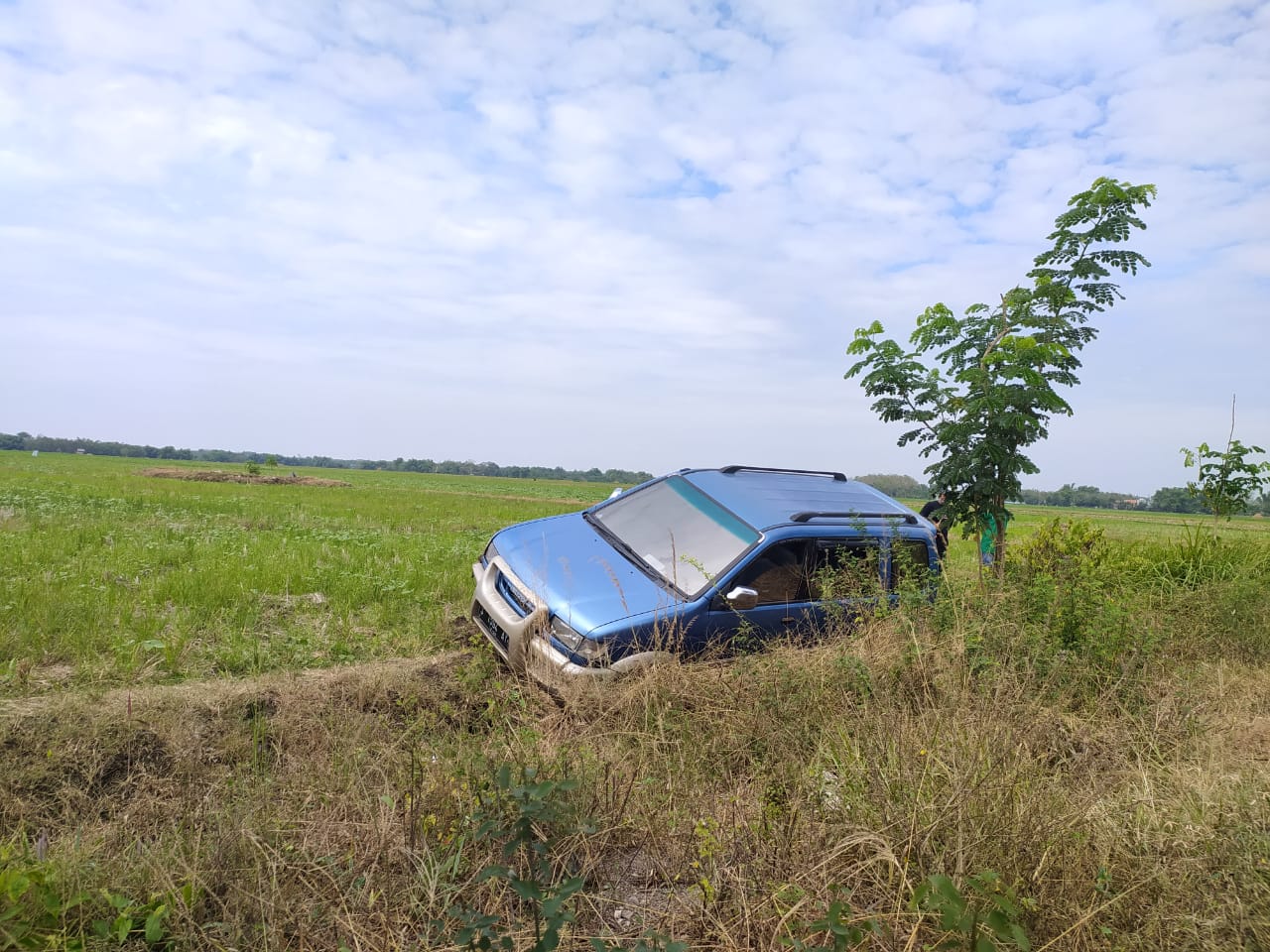 Diduga penyebab tergelincirnya mobil panther warna biru tersebut dikarenakan bahu jalan dengan kondisi barem yang tidak rata atau tidak seimbang dengan badan jalan.