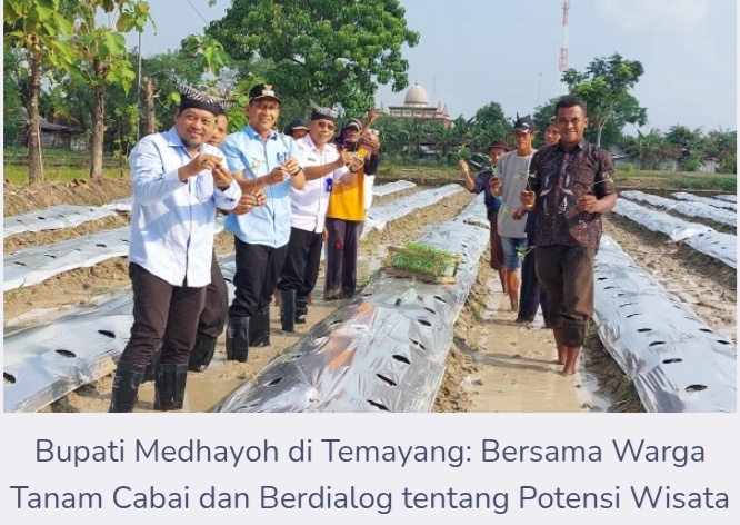 Kegiatan medhayoh Bupati Bojonegoro kali ini diawali dengan aksi tanam cabai bersama petani setempat di lahan Sawah, barat Balai Desa Ngujung.