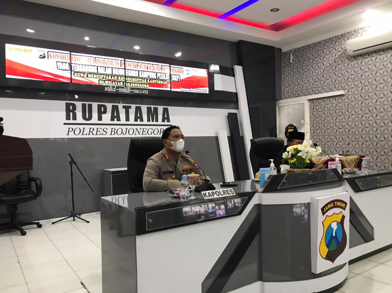 Bojonegoro | MMCNews.Id , – Untuk menciptakan situasi Keamanan Ketertiban Masyarakat (Kamtibmas) di wilayah hukum Polres Bojonegoro, Kapolres Bojonegoro Ajun Komisaris Besar Polisi (AKBP) EG Pandia memimpin Konsolidasi Ketua Perguruan Pencak Silat Se Kabupaten Bojonegoro yang tergabung dalam Bojonegoro Kampung Pesilat (BKP) yang digelar di Gedung Rupatama AP I Rawi Mapolres Bojonegoro, (6/10/2021).