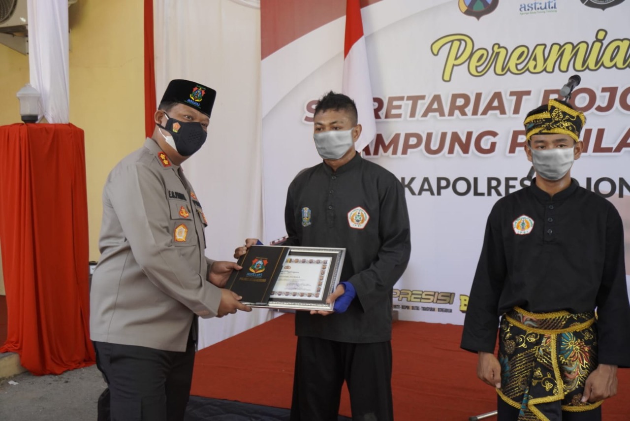 Bojonegoro | MMCNews.Id ,– Kapolres Bojonegoro AKBP EG Pandia memberikan penghargaan dan tali asih kepada dua pendekar pencak silat dari Bojonegoro yang berprestasi diajang tingkat Jawa Timur maupun Nasional.
