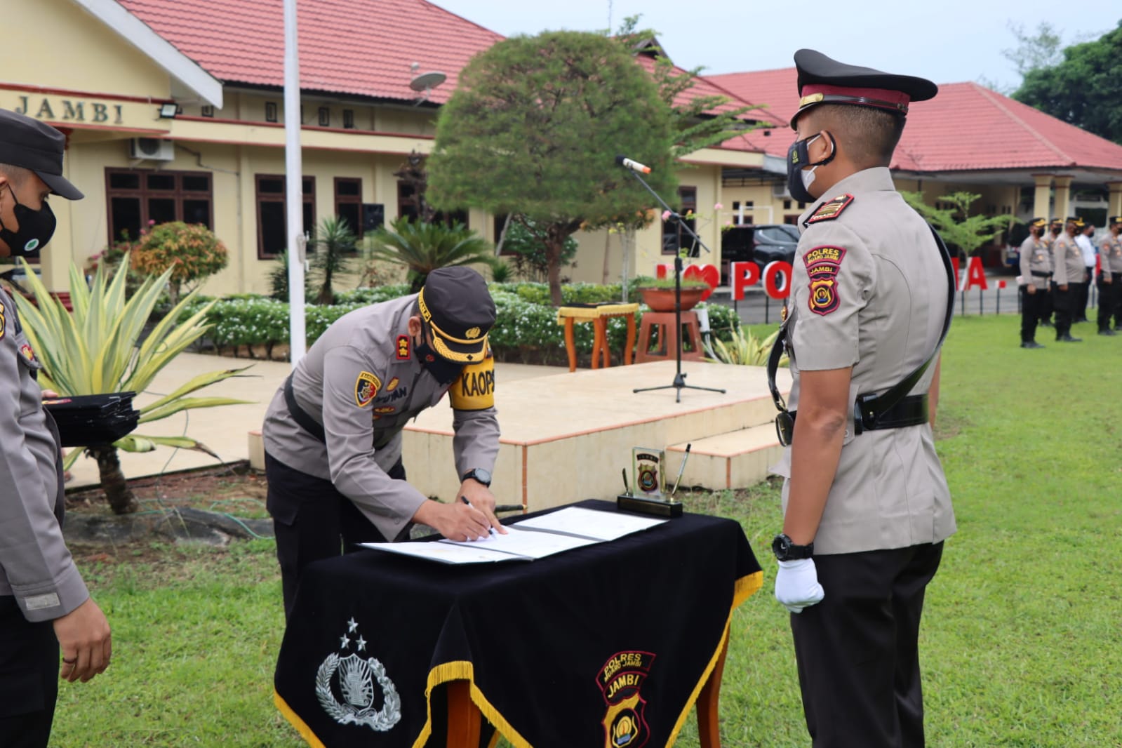 MUARO JAMBI | MMCNEWS – Kapolres Muaro Jambi Pimpin pelaksanaan Sertijab Pejabat Utama dan para Kapolsek yang dilaksanakan di Mapolres Muaro Jambi,Sabtu (05/03/22).