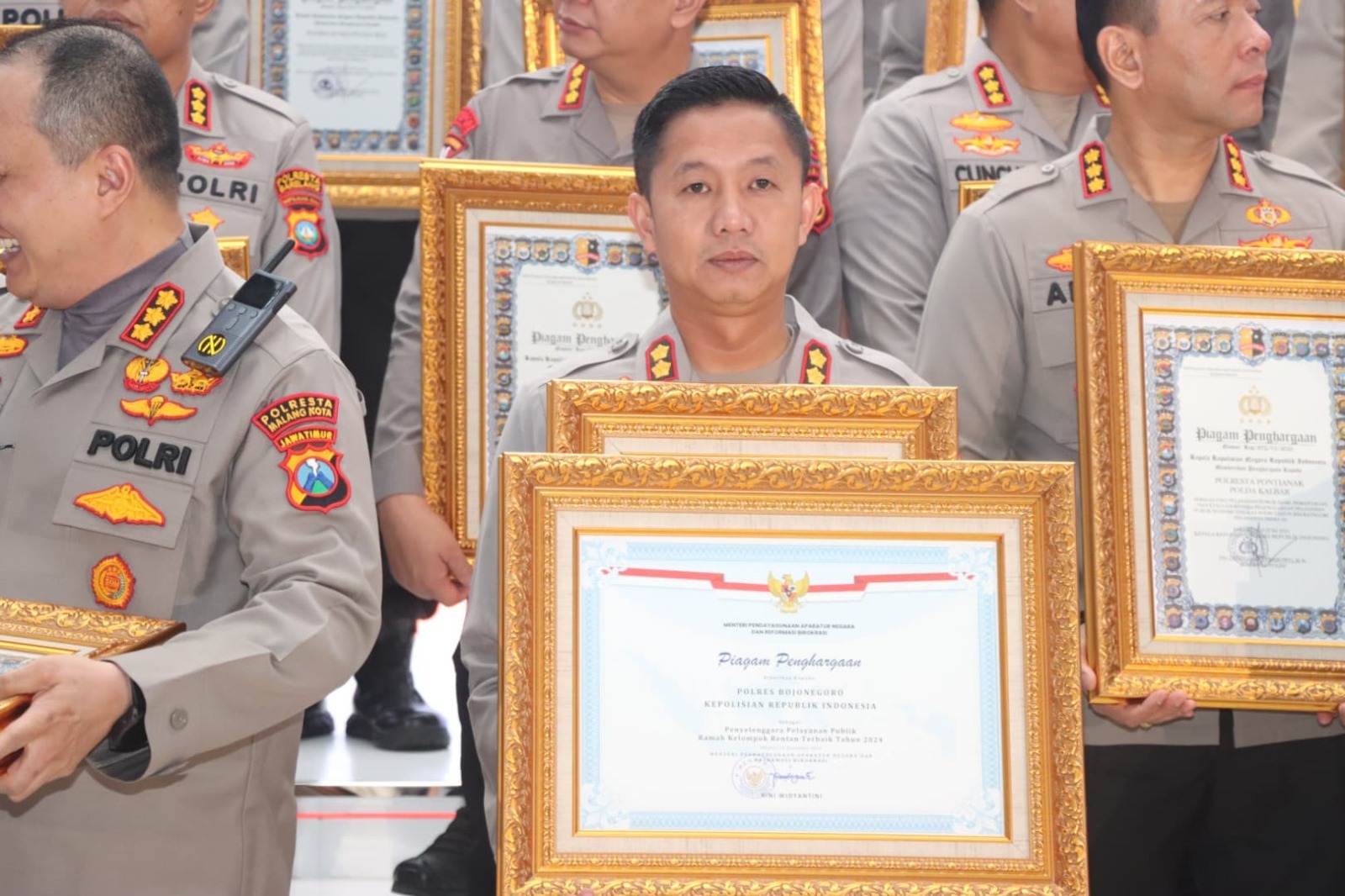 Salah satu penerima penghargaan yang mencuri perhatian adalah Kapolres Bojonegoro, AKBP Mario Prahatinto, S.H., S.I.K., M.Si. Ia berhasil membawa pulang dua penghargaan sekaligus. Pertama, penghargaan dari Kementerian Pendayagunaan Aparatur Negara dan Reformasi Birokrasi (KemenPAN-RB) sebagai Penyelenggara Pelayanan Publik Ramah Kelompok Rentan Terbaik Tahun 2024.