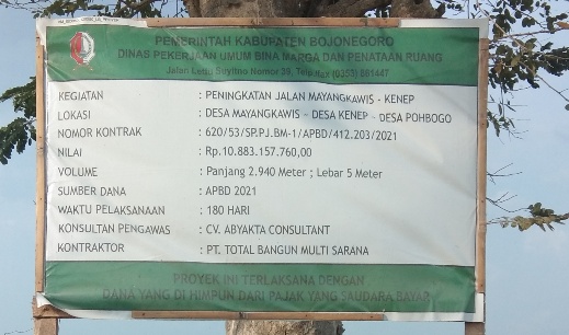 Seperti pekerjaan proyek peningkatan jalan dengan konstruksi rigid pavement di desa Mayangkawis – Kenep – Pohbogo, Kecamatan Balen Kabupaten Bojonegoro Jawa Timur.