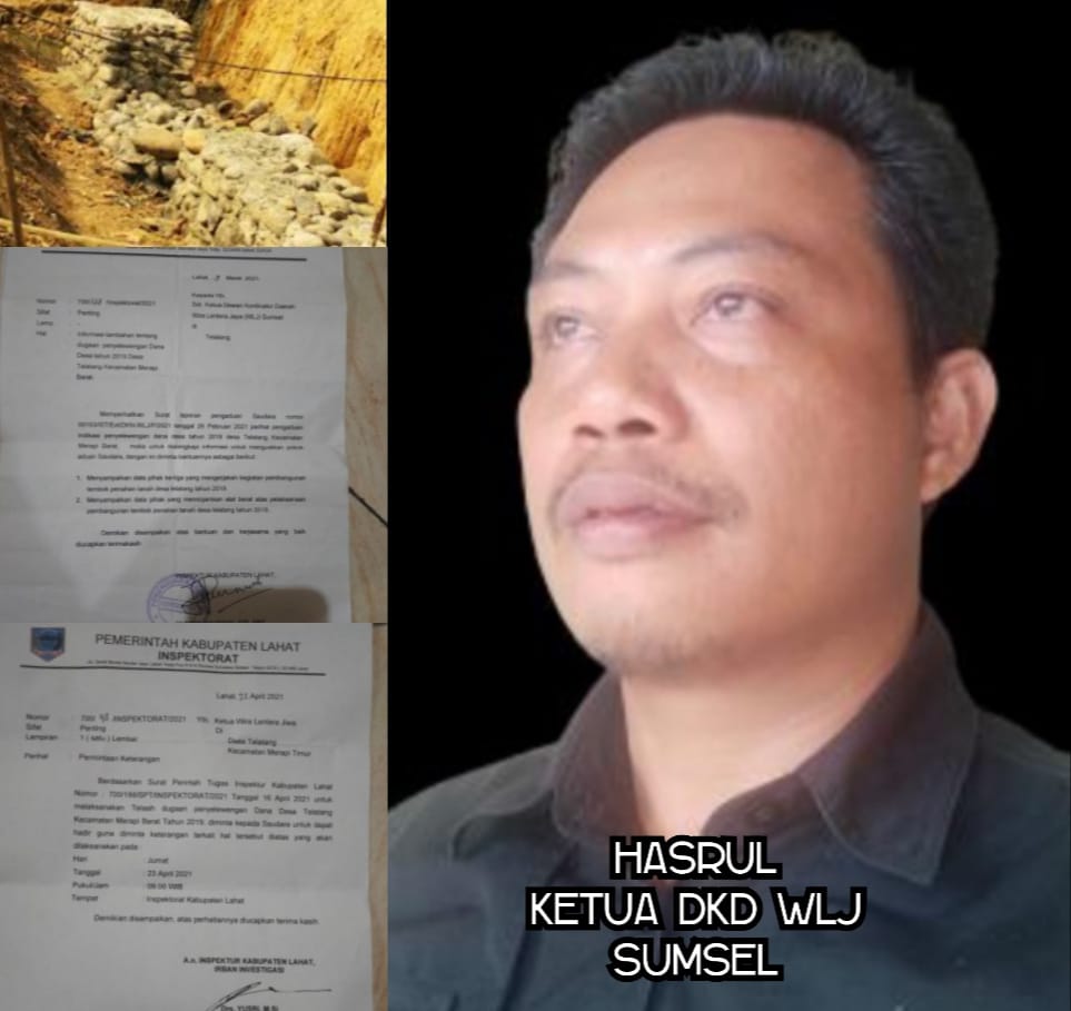 Dilain sisi Ketua DKD WLJ Propinsi Sumsel Hasrul beberapa waktu lalu tepat nya pada tanggal 26 Februari 2021 telah melayangkan surat kepada Inspektorat kabupaten lahat tentang laporan terhadap Kades Hedi Marlian yang diduga telah melakukan penyelewengan Dana Desa tahun 2019 dengan Nomor surat : 00152//ST/Ext/DKN/WLJ/P/2021.