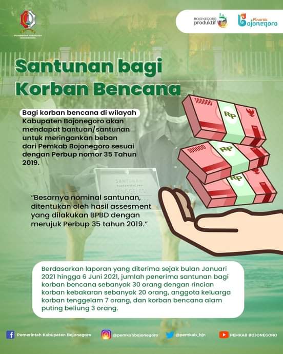 Ketua Pelaksana Program Santunan Korban Bencana Ardhian Orianto mengatakan, kebijakan ini sesuai dengan Peraturan Bupati nomor 35 tahun 2019. Yakni Pemkab Bojonegoro akan memberikan santunan bagi individu, keluarga/masyarakat korban bencana dengan kriteria yang telah ditentukan.