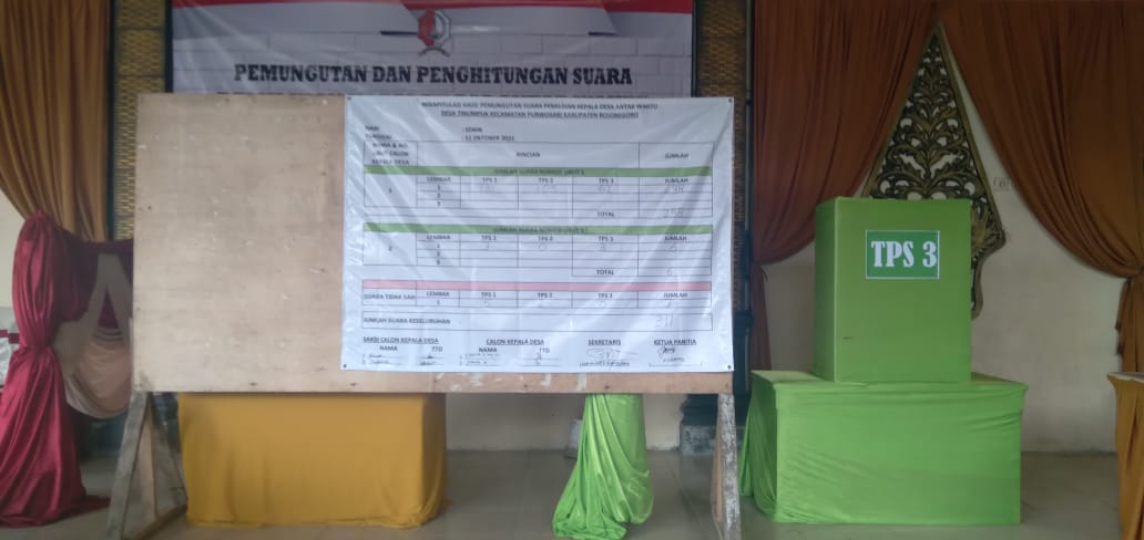 Bojonegoro | MMCNews.Id ,- Pelaksanaan Pilkades (PAW) Desa Tinumpuk, Kecamatan Purwosari, Bojonegoro, diselenggarakan di pendopo dan halaman balai desa setempat. Pada Senin, (11/0/10/2021).
