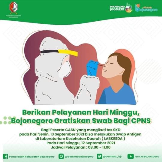 Sebagai informasi, swab test antigen menjadi salah satu persyaratan bagi peserta Calon Pegawai Negeri Sipil (CPNS) dan Pegawai Pemerintah dengan Perjanjian Kerja (PPPK) untuk mengikuti tes seleksi kompetensi dasar (SKD). Maka, untuk memperlancar jalannya tes tersebut, Pemkab Bojonegoro menggratiskan tes swab antigen bagi para peserta.
